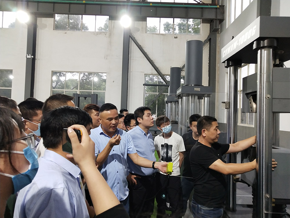 在公司董事长、总经理、研发部长的陪同下,各位专家参观了我公司九游官方网页版厅并对相关设备表现出浓厚的兴趣。期间,董事长阮伟鑫向专家详细介绍了产品主要性能及先进的技术创新,研发部长徐峰现场演示热轧带肋钢筋拉伸试验,设备的优良性能令客户啧啧称赞。